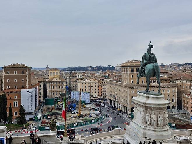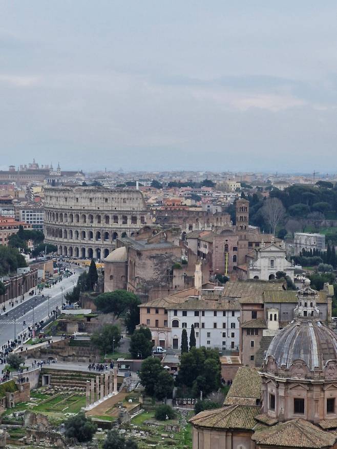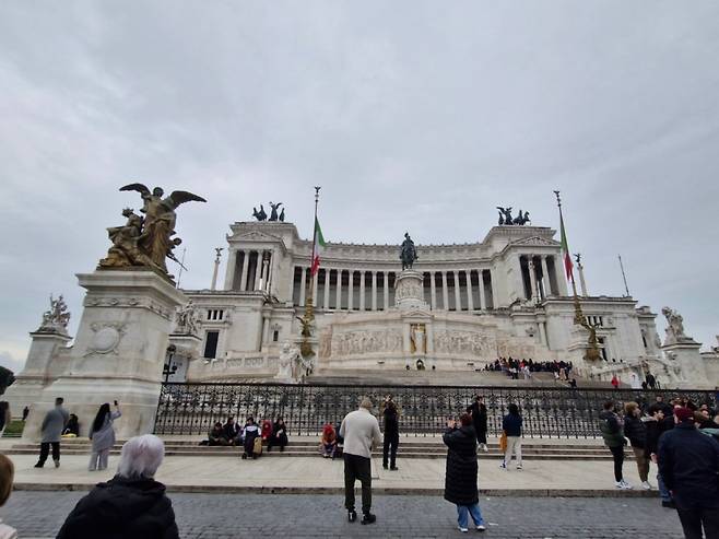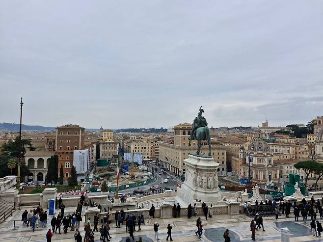 포로 로마노를 관람하고 나오는 길에 거대한 건물이 하나 있다. 비토리오 에마누엘 2세 기념관이다. 1870년 이탈리아의 통일을 이룬 에마누엘 2세를 기념해 만든 건물인데 1885년부터 25년에 걸쳐 네오 클래식 양식으로 만들었다고 한다. 계단 위 중앙에는 그의 기마상이 높게 세워져 있다. 올라가서 외부를 둘러보는 건 무료다. 내부 독립운동 역사관과 전망대를 보는 건 유료다. 전망대는 기념관 뒷편 엘리베이터로 올라갈 수 있는데 20여분 정도 기다려야 한다. 올라가면 콜로세움과 포로 로마노는 물론 로마 시내의 전경을 한눈에 내려다볼 수 있다.