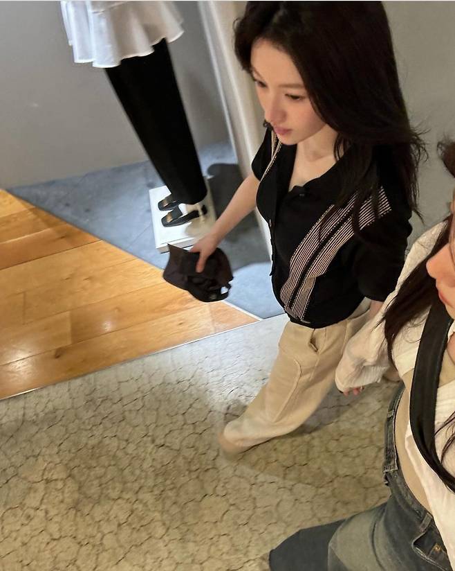 또, 고윤정은 베이지 팬츠를 매치해 차분하고 도회적인 코디를 완성했습니다.