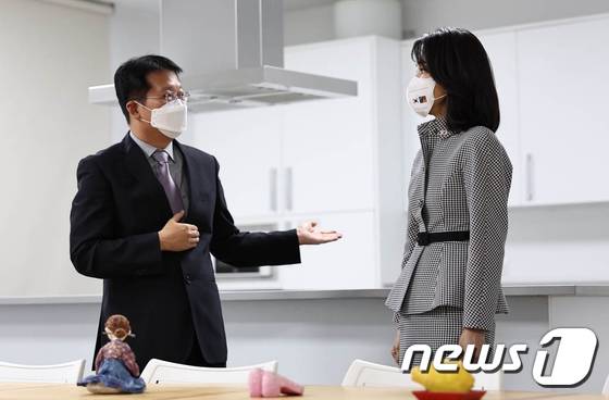(마드리드=뉴스1) 오대일 기자 = 윤석열 대통령 부인 김건희 여사가 28일 오후 (현지시간) 주스페인한국문화원을 방문해 오지훈 문화원장과 대화하고 있다. (대통령실사진기자단) 2022.6.29/뉴스1