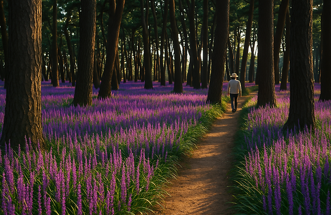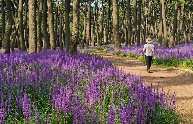 푸른 해송 숲과 보랏빛 맥문동이 가득한 산책길,