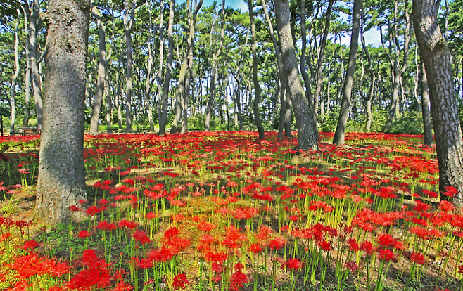 특히 여름이면 약 600m 길이의 해송 숲길 아래 10만 포기의 맥문동이 피어나 보랏빛 물결을 이루며 산책객을 맞이합니다.