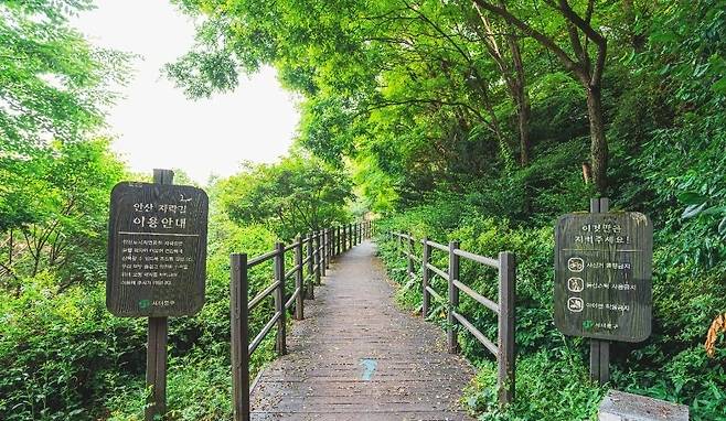 안산자락길은 총 7km 길이의 전국 최초 순환형 무장애 숲길이다. 장애인과 노약자, 어린이 등 보행약자는 물론 휠체어와 유모차도 편하게 이용할 수 있도록 조성돼 누구나 숲을 가까이에서 즐길 수 있다. 완만한 경사와 데크길 위주로 설계돼 부담 없이 걸을 수 있는 점이 특징이다.
