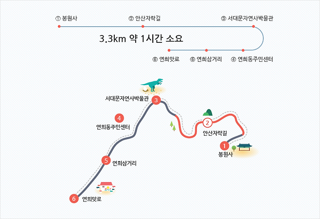 코스1) 신촌역 → 봉원사 경로, 6.5km, 약 2시간 소요