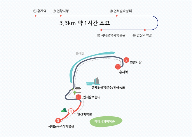코스5) 홍제역 → 서대문자연사박물관 경로, 3.3km, 약 1시간 소요