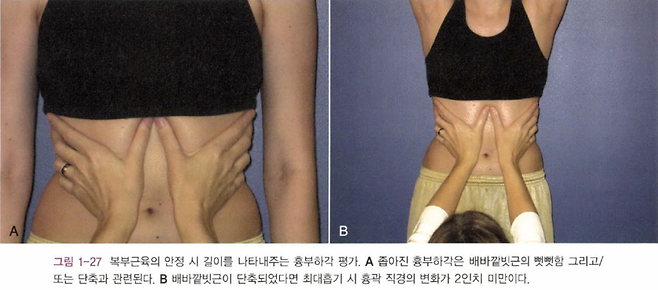 외복사근은 크게 단축됐을때와 늘어났을 경우에 문제점이 있을 수 있구요더 나아가서는 한쪽만 단축되는 불균형이 있을 수 있겠죠~그 기준은 갈비밑 각도를 측정하는 건데요~사진처럼 명치밑에 엄지손가락을 대서 그 각도를 90도를 기준으로해서그것보다 심하게좁은 경우는 외복사근이 단축됐다고 판단하구요~`각도가 100도 이상인 경우에는 외복사근이 늘어나 있다고 판단합니다~그리고 손가락을 댄후에 가슴으로 숨을 크게 마시면 흉곽 확장이 제한되거나한쪽만 흉곽이 따라 올라가면 기능적으로 불균형이 있다고 판단하는 것이죠~흉곽의 경직과 호흡의 문제라면 반드시 hollowing과 bracing으로써동시수축을 만들 필요가 있겠죠~