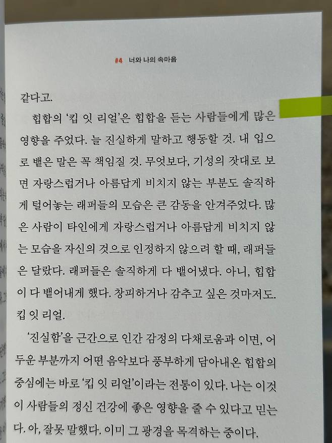 <힙합과 한국>의 마지막 페이지까지 모두 읽고 책을 덮은 다음 내가 품게 된 문장이다. ‘킵 잇 리얼!(Keep it real!)’ 힙합에서 자주 등장하는 이 외침은 '너 자신의 진짜 이야기를 하고, 거짓말하지 말고 늘 진실할 것’을 뮤지션 자신에게, 힙합을 듣는 이들에게 온몸으로 말하고 있구나 싶었다. 진솔한 자기 서사를 바탕으로 한 힙합의 랩은 흡사 글쓰기 장르에서의 에세이와 많이 닮아있다는 생각에 이르렀다. 나의 이야기를 솔직하게 써 내려갈 때 전해지는 공감과 영감을 떠올렸다.