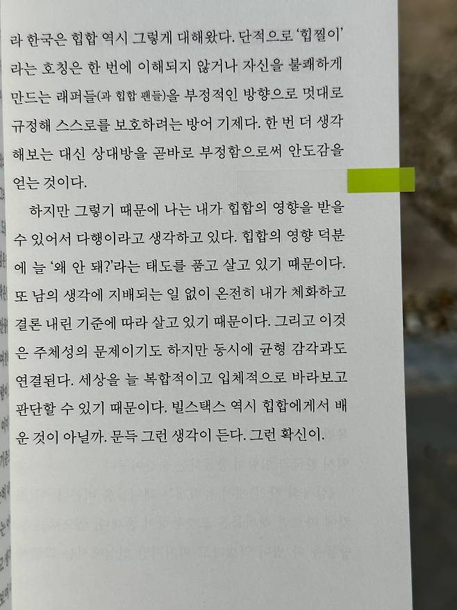 힙합의 영향 덕분에 늘 '왜 안 돼?'라는 태도를 품고 살고 있기 때문이다. 또 남의 생각에 지배되는 일 없이 온전히 내가 체화하고 결론 내린 기준에 따라 살고 있기 때문이다. 그리고 이것은 주체성의 문제이기도 하지만 동시에 균형 감각과도 연결된다. 세상을 늘 복합적이고 입체적으로 바라보고 판단할 수 있기 때문이다.