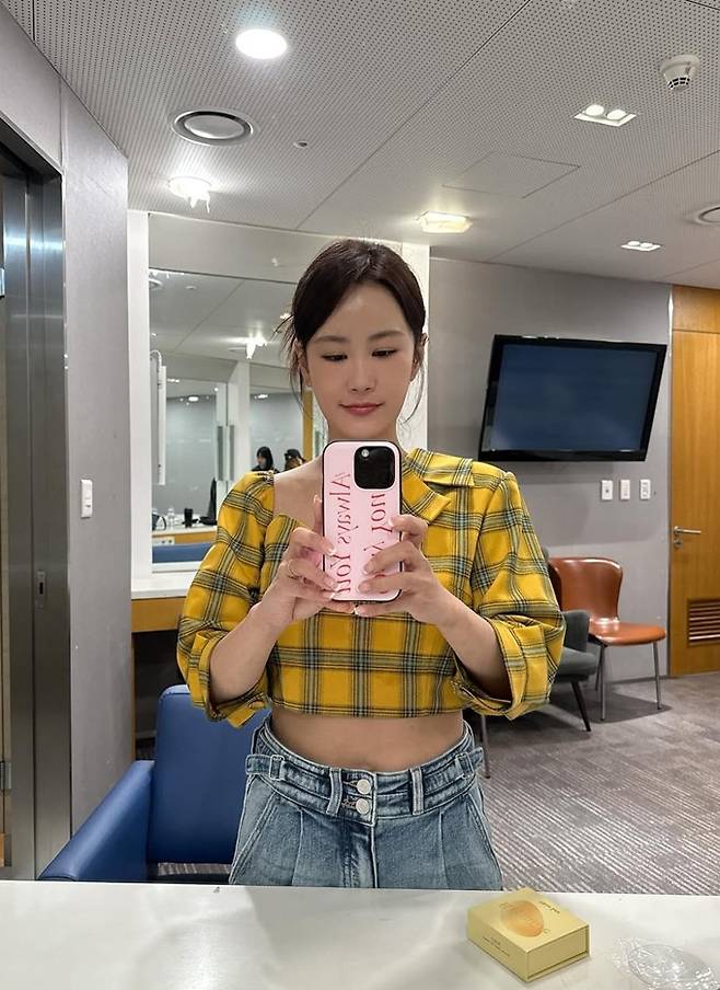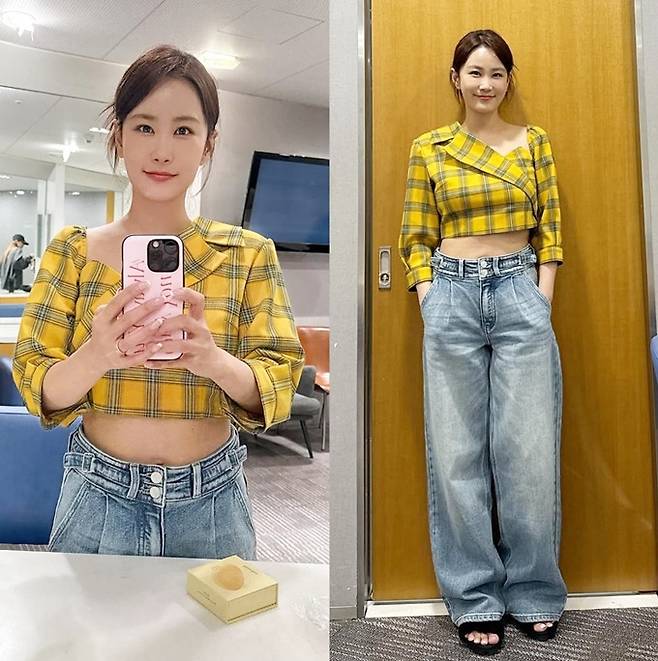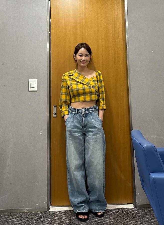 공개한 사진에서 김지민은 가녀린 개미허리가 드러난 옐로 체크 크롭톱에 원턱 데님 팬츠를 매치한 출근룩으로 힙하면서도 섹시한 스타일을 선보였다.