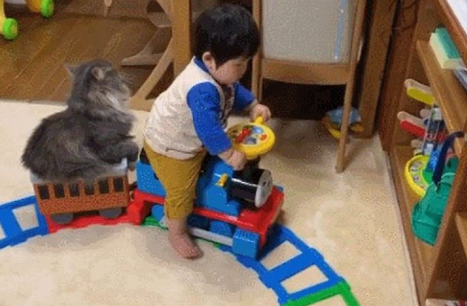 고양이들은 아기와 함께 장난감 기차를 타고 놀거나, 작은 박스 안에서 함께 시간을 보내는 모습을 보였습니다.