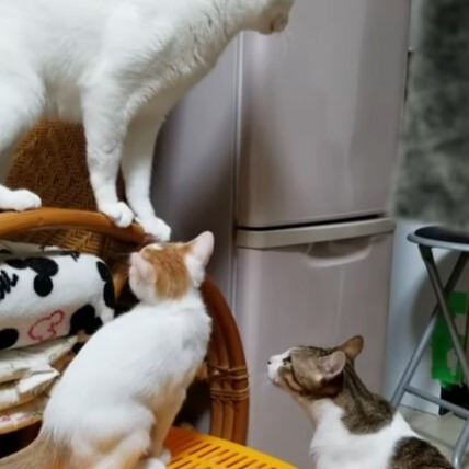 흰 고양이의 공격이 더욱 거세지자 새끼 고양이가 다시 등장했습니다. 가느다란 울음소리로 "싸우지 마세요"라고 말하는 듯한 소리를 내며 두 마리 사이로 들어갔습니다.