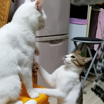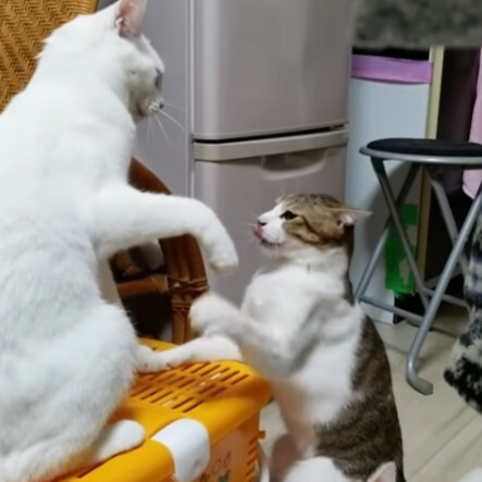 한 집에서 성묘 두 마리가 격렬한 싸움을 벌이는 모습이 포착되었습니다. 흰 고양이와 고등어 고양이가 서로 양보하지 않는 상황에서 치열한 고양이 펀치를 주고받았습니다.