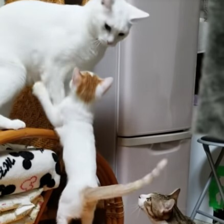 흰 고양이는 바구니 위에 올라가 우위를 점하며 공격적인 자세를 취했습니다. 고등어 고양이도 지지 않고 털복숭이 앞발로 연속 공격을 가하며 맞섰습니다.
