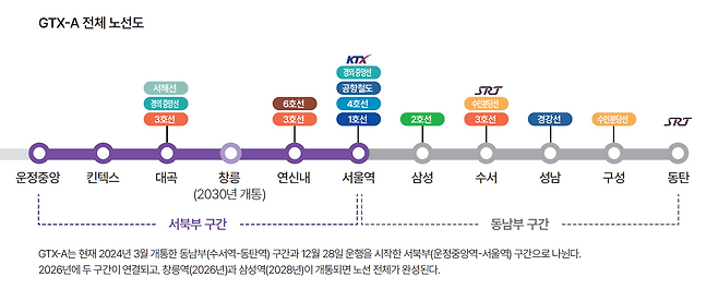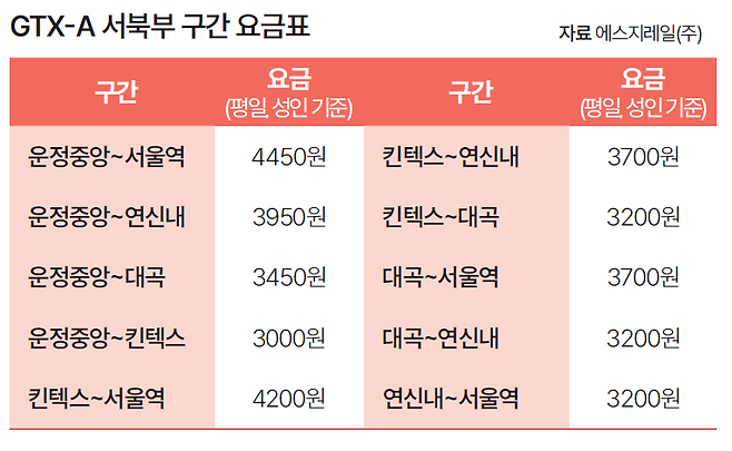 2026년 수서~동탄 구간(2024년 3월 개통)과 연결되고 2026년 창릉역(경기 고양시), 2028년 삼성역(서울 강남구)이 개통되면 GTX-A 노선은 총 연장 82.1㎞에 정차 역은 11개가 됩니다. 운임은 기본요금 3200원에 10㎞를 초과할 때부터 5㎞마다 추가 거리 요금 250원이 붙는 식입니다. 평일 이용 시 운정중앙~서울역 구간 요금은 편도 기준 4450원입니다.