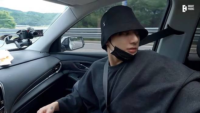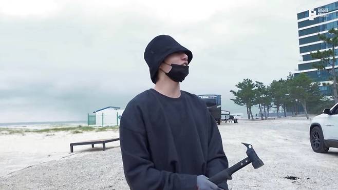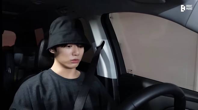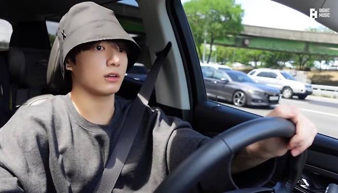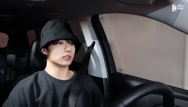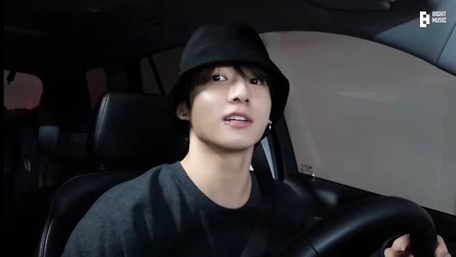 정국은 블랙 슬리브와 버킷햇으로 올블랙 패션을 완성했습니다.