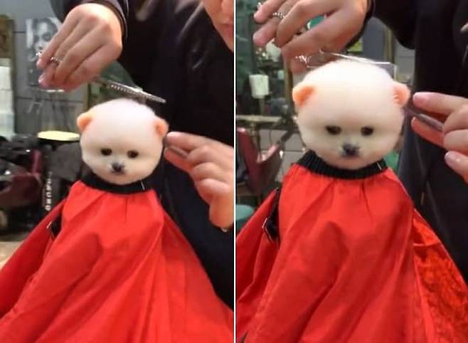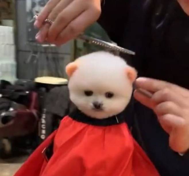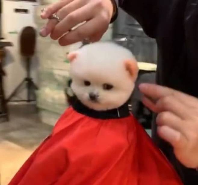 보고 또 봐도 두 눈을 휘둥그레 만드는 귀여운 솜뭉치의 손님 정체는 다름아닌 강아지였습니다. 미용실에서 이렇게 미용하는 강아지는 또 처음입니다.