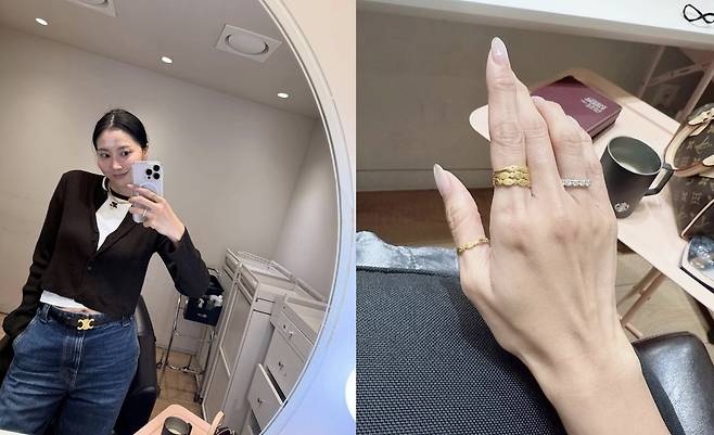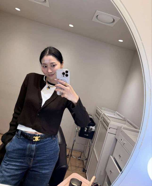 하의로는 하이웨이스트 생지 데님 팬츠를 선택해 다리 라인을 길어 보이게 했으며, 골드 버클이 돋보이는 벨트로 스타일의 완성도를 높였습니다.