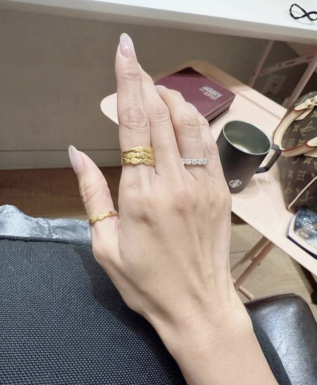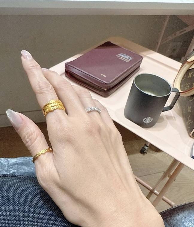 독특한 디자인의 물고기 모양 골드 반지를 여러 개 겹쳐 착용하고, 다이아몬드 링과 믹스 매치해 유니크하면서도 우아한 주얼리 스타일을 완성했습니다.