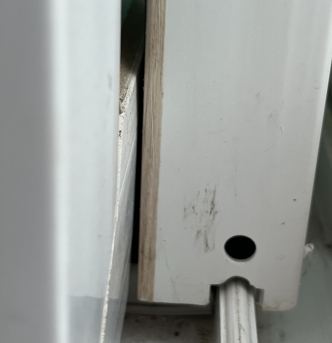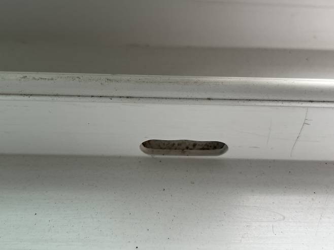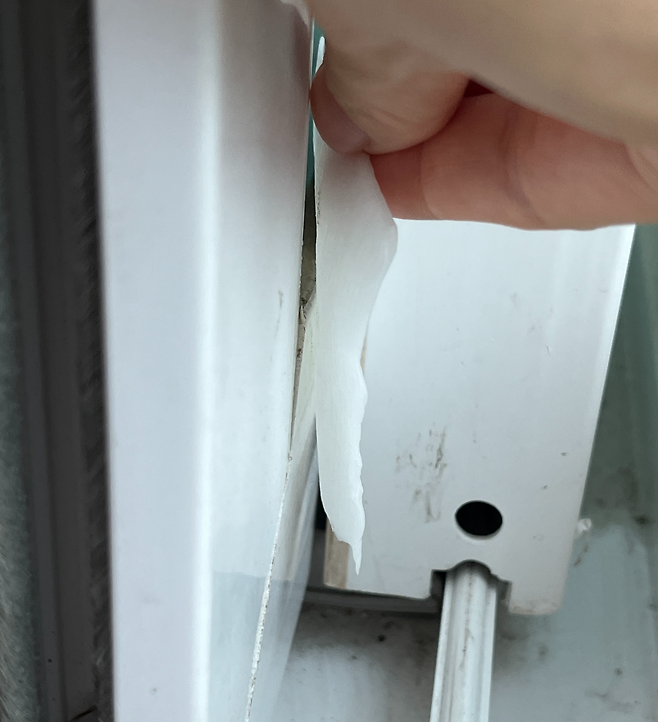 창틀 아래쪽을 보시면 물구멍이 따로 있는데요. 이곳을 통해서도 벌레가 쉽게 유입될 수 있습니다. 그래서 이곳을 막아주면 벌레 유입을 줄일 수 있습니다.