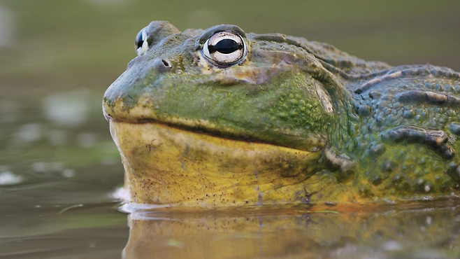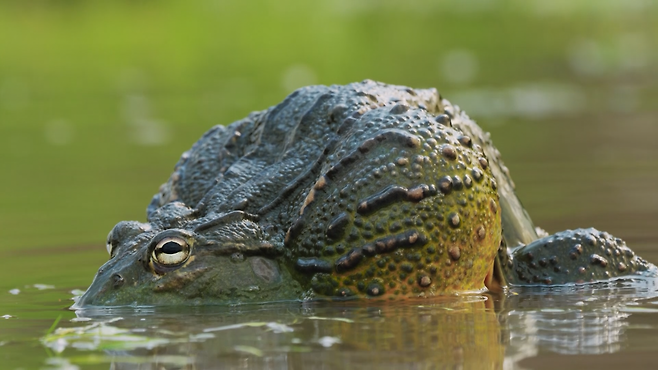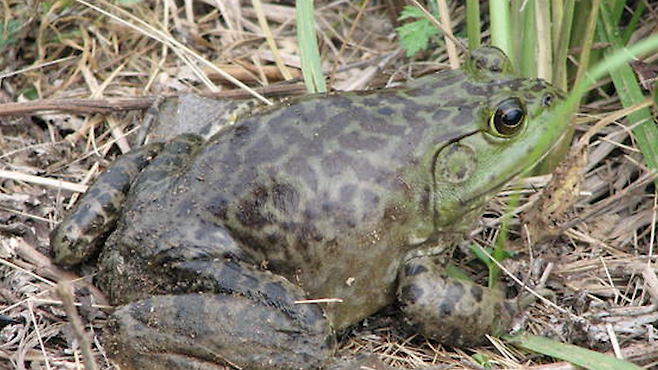 인간이 식용과 농가소득용으로 들여왔다가 돈이 안되니까 곳곳에 버려져서 국내 하천생태계를 교란하고 있는 황소개구리.