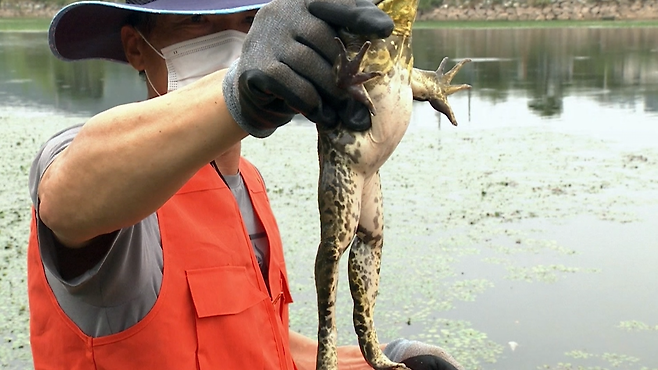 울음소리마저 황소가 우는 거 같다고 하는 녀석인데 요즘 보이는 황소개구리는 전반적으로 좀 살이 빠진 느낌? 유튜브 댓글로 “황소개구리 크기가 작아졌다는게 진짜인지 궁금하다”는 의뢰가 들어와 취재했다.