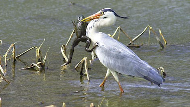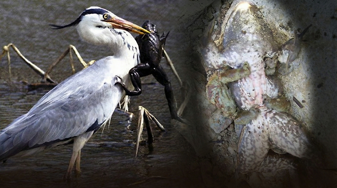 황소개구리가 뱀도 잡아먹는 먹이사슬 파괴자였는데 배를 갈라보니 곤충과 조류 등 가리지 않고 60개 종류 먹이가 들어있었을 정도로 덩치가 커져서 토종생물들에겐 놓칠 수 없는 먹이였을 거다.