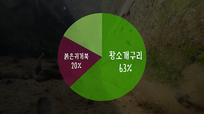 국립생태원이 충청도와 전라도, 광주 대전 세종 등 259곳을 조사해보니 외래 양서류와 파충류가 1400마리가 있었는데 그중 63%가 황소개구리였고 붉은귀거북이 20% 정도였다고 한다.