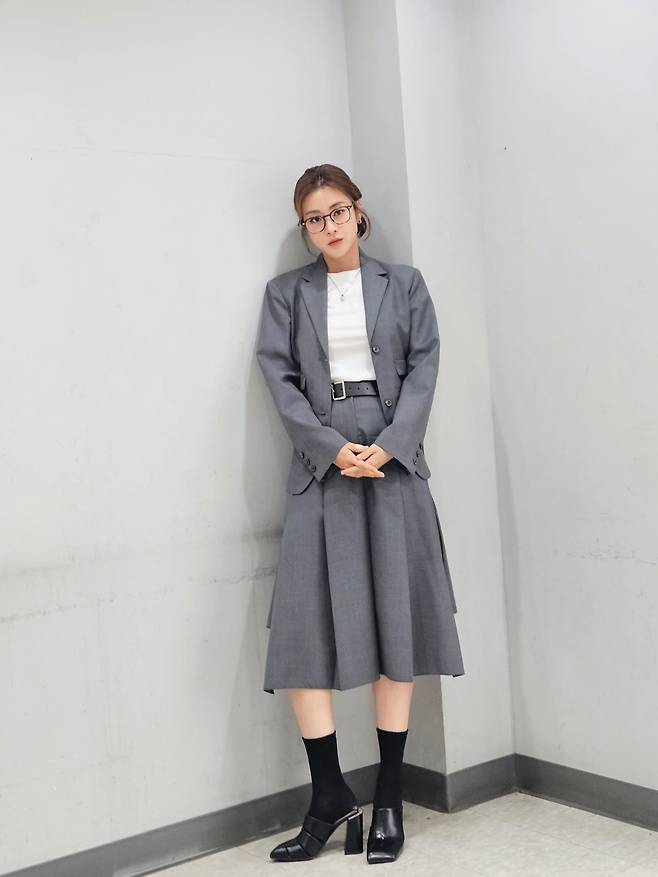 재킷과 플리츠 스커트로 이뤄진 그레이 수트는 군더더기 없이 깔끔했고, 안에 매치한 화이트 톱이 룩의 밸런스를 차분히 잡아줬죠.