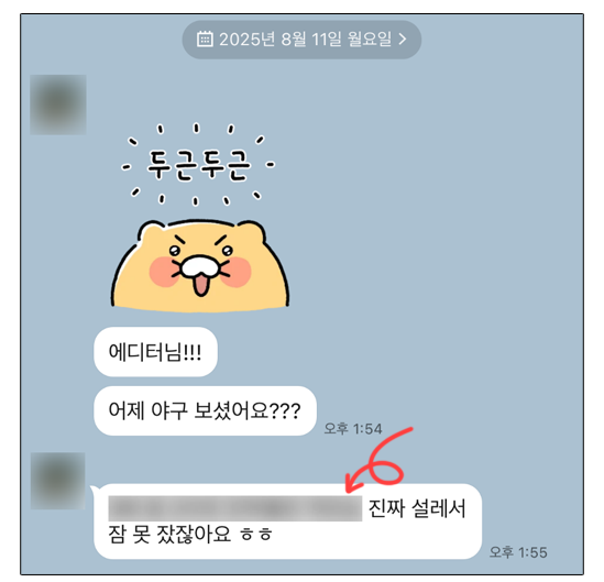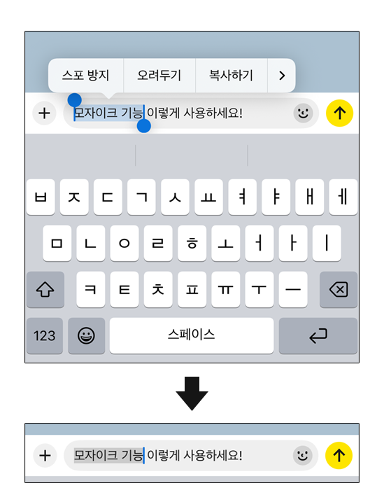 이제 보내기 버튼을 누르면 상대방은 내 메시지 일부 영역이 모자이크 처리되어 노출될 것이다. 상대방이 숨김 처리된 메시지를 확인하고 싶다면 해당 부분을 손으로 터치하거나 마우스로 클릭하면 된다.