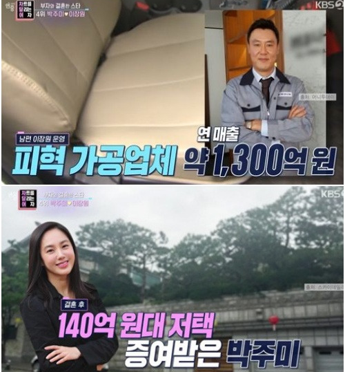 박주미의 남편 이장원 씨는 현재 피혁 가공업체 대표로 재직 중이고 이 업체의 연매출은 약 1300억 원으로 알려졌습니다. 그런가 하면 박주미는 결혼 후 시부모에게 140억대 저택을 증여받은 것으로도 전해져 놀라움을 더했습니다.