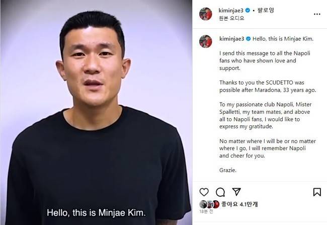뮌헨 공식 발표가 올라오기 전 김민재는 개인 SNS를 통해 나폴리 팬들에게 작별인사를 했다.