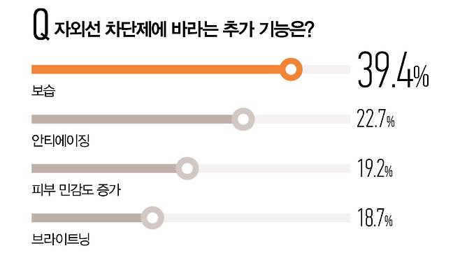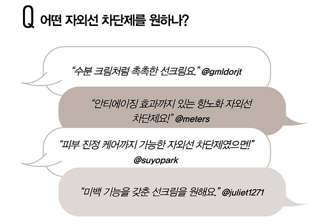 피부에 닿는 햇살이 따가워지는 계절이다. 겨우내 민감하고 약해진 피부에 자외선은 최대의 적. 봄볕으로부터 피부를 보호하는 자외선 차단제를 구비해야 할 때다. 하지만 불경기로 인해 소비에 부쩍 깐깐해진 소비자는 자외선 차단제 하나도 그냥 구입하지 않는다. ‘기왕 자외선 차단제를 바를 거라면 피부 겉만 보호할 게 아니라 속까지 케어하는 제품이라면 더 좋지 않을까?’라는 생각에 피부 안팎으로 멀티 케어를 하는 자외선 차단제를 찾는다. 현명해진 소비자 사이에서 자외선 차단 기능만 하는 선크림은 더 이상 매력적이지 않다. 이런 사실은 <뷰티쁠> 설문 조사에서도 여실히 드러났다.