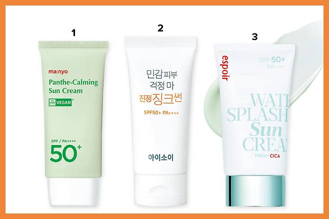 피부가 극도로 민감한 사람은 자외선 차단제도 가려 써야 한다. 자외선으로부터 피부를 철벽 보호하는 동시에, 자극받은 피부를 빠르게 잠재우고 다독이는 성분을 담은 선크림이 필요하다. No.1 진정 성분인 병풀 추출물을 함유하거나 알로에, 녹차 추출물, 허브 추출물 등을 담은 선크림을 눈여겨보길 추천한다.