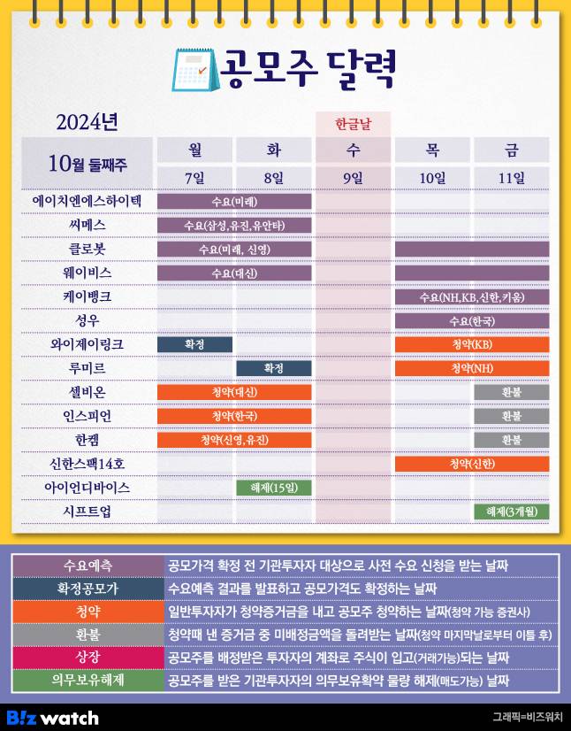 아울러 △셀비온 △인스피언 △한켐 △신한스팩14호 △와이제이링크 △루미르 6곳이 이번주 청약을 진행해요.