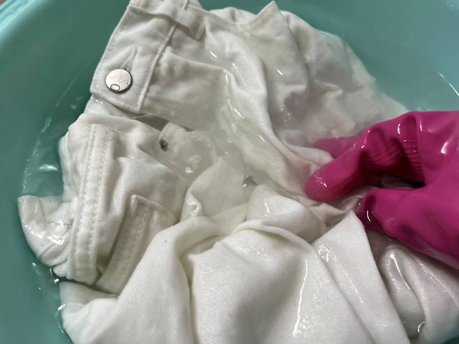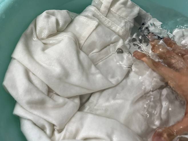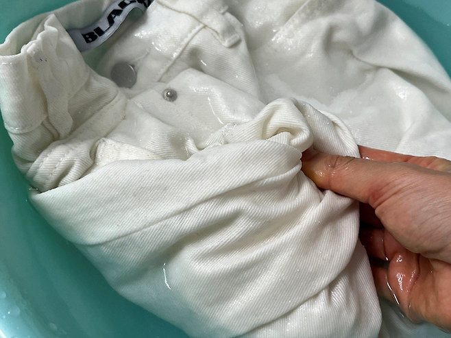 이 상태로 약 30분 담가두면 얼룩이나 오염이 옅어집니다. 손으로 주물러가며 빨아 주면 누런 때나 얼룩이 쉽게 제거됩니다.