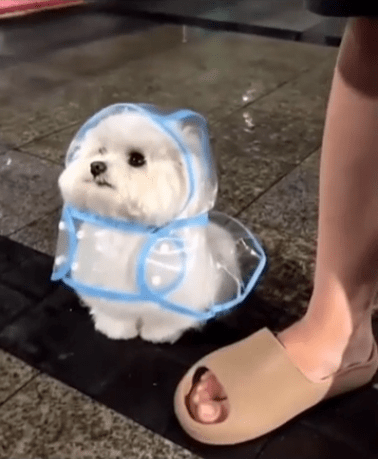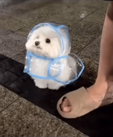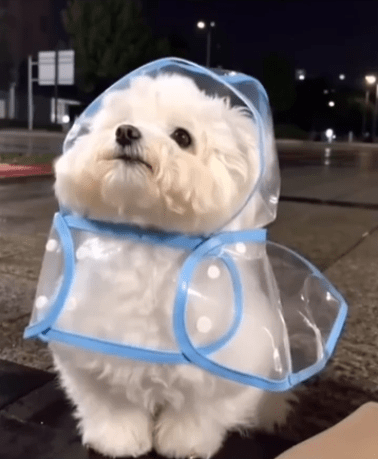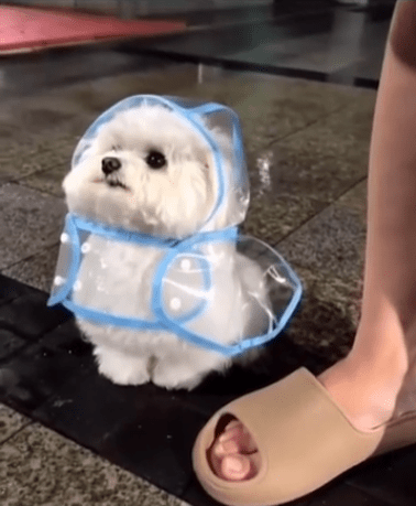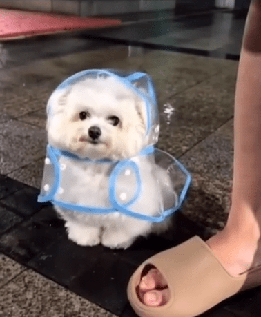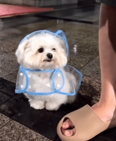 우비는 몸집보다 살짝 커 보이고, 두 귀는 얇은 비닐 속에서 살짝 눌려 있습니다. 비닐 모자는 작게 덮인 채로 고정돼 있고, 강아지의 이마 위에서 살짝 들썩입니다. 흐릿한 비닐 너머로 보이는 눈망울은 커다랗고 또렷하며, 마치 “괜찮아요, 저는 여기 있어요”라고 말하는 듯한 침착한 표정을 담고 있죠.