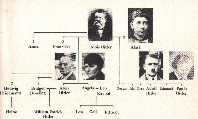 아돌프의 아버지 알로이(Alois)는 그의 어머니 클라라(Klara)와 결혼하기전 프란니(Franni)라는 한 여성과 결혼을 하였습니다. 그리고 그는 프란니와 함께, Alois Jr.와 Angela라는 두명의 아이들을 낳았습니다.
