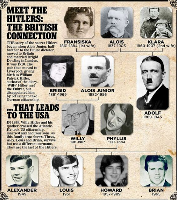 아돌프 히틀러와 그의 아내 에바 브라운은 결혼식을 올린 다음날 함께 자살하였으며, 히틀러의 유일한 직계 친족 여동생인 파울라 히틀러는 아예 결혼을 하지 않았습니다. 히틀러가 사생아를 낳았다는 소문도 있긴했지만, 알려진바에 따르면 그 두명에게는 자식이 없었으며 그로인해 사람들은 그의 끔찍한 유전자를 물려받은 자손이 없다고 믿어왔습니다.