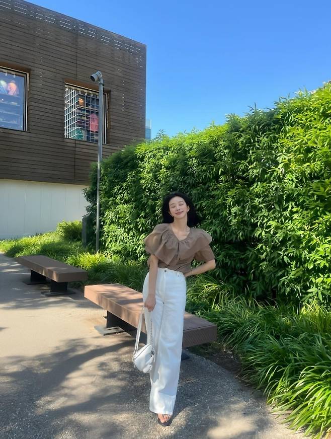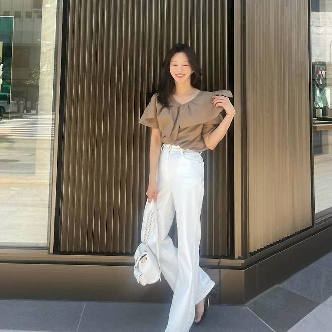 “마지막 휴가를 함께 해 준 나의 시슬리”라는 멘트와 함께 공개된 사진 속 이주빈은 행복감이 넘쳐 보입니다. 브라운 컬러의 러플 블라우스는 독특한 카라 디자인과 자연스러운 주름이 더해져 발랄하면서도 세련된 분위기를 연출합니다. 여기에 화이트 데님 팬츠를 매치해 여름 데일리 패션의 정석을 보여주고 있습니다.