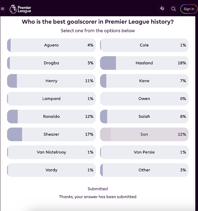 프리미어리그 시대 최고의 골잡이 후보에 손흥민(전 토트넘, 현 LAFC)이 당당히 이름을 올렸다. 9일 현재 손흥민은 12%의 득표율로 엘링 홀란(맨체스터 시티), 리그 최다 득점(260골)으로 17%를 얻은 앨런 시어러(전 블랙번·뉴캐슬)에 이어 공동 3위다. 크리스티아누 호날두(전 맨체스터 유나이티드)와 동률이다.