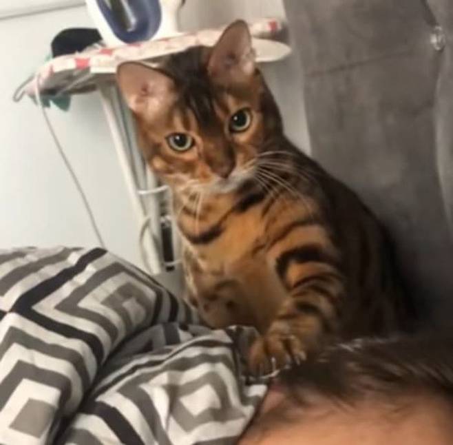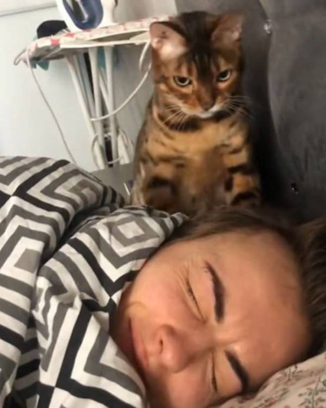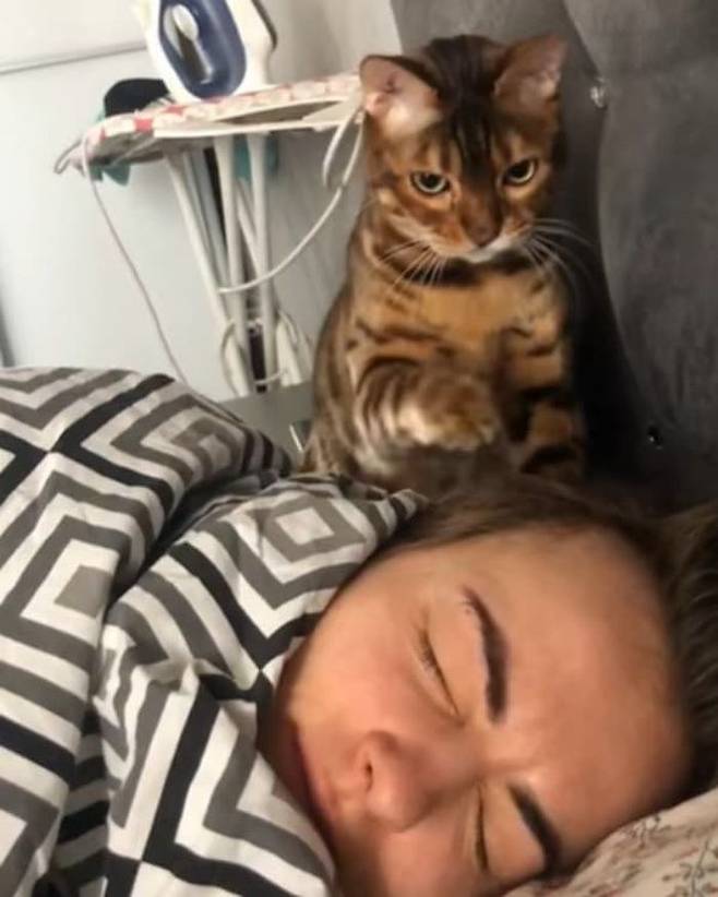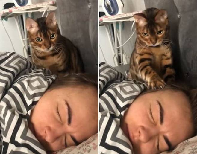 사연은 이렇습니다. 집사 엘레나 마티아시(Elena Matiash)는 SNS 계정을 통해 더 자고 싶은 자신과 억지로 깨우려는 벵갈 고양이의 모습을 담은 영상을 공개했죠.