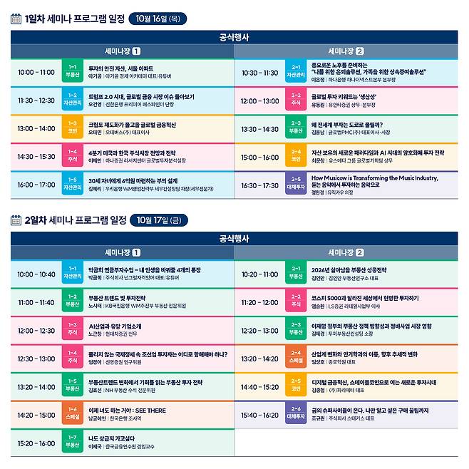 올해 행사는 화려한 연사 라인업을 필두로 규모와 프로그램 모두 강화됐다. 부동산·자산관리·주식·가상자산·대체투자 등 분야별 전문가의 23개 강연이 준비됐다. 5대 금융지주를 비롯해 주요 금융사와 증권·보험·건설사 등 30개 기업이 자산관리 부스를 운영해 세밀한 전략도 제시한다. 이벤트 부스 5개, 전시 부스 25개가 마련됐다.