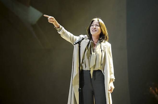 팬츠는 하이웨이스트 슬랙스로 다리를 길어 보이게 했으며, 전체적으로 중성적이면서도 고급스러운 무대 패션을 완성했습니다.