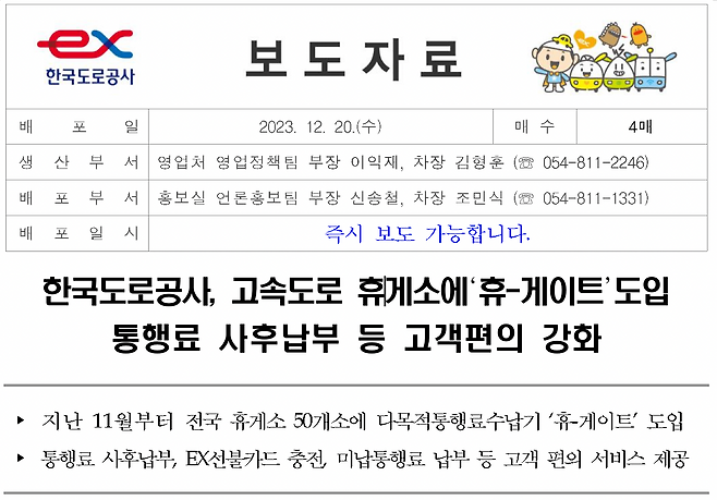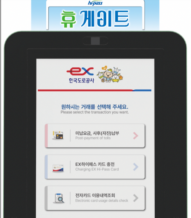 한편 한국도로공사는 고속도로 미납 통행료 사후 납부자가 지속해서 증가하는 추세에 주목하면서 전국 휴게소 50개소에 다목적 통행료 수납기인 ‘휴-게이트’를 도입해 운영한다고 밝혔습니다. 휴-게이트라고 이름 붙여진 다목적 통행료 수납기는 휴게소 안에서 영업소 업무를 처리할 수 있는 키오스크(무인정산단말기)를 뜻하며, 고객의 사후 납부 편의 향상 등을 위해 도입되었습니다.