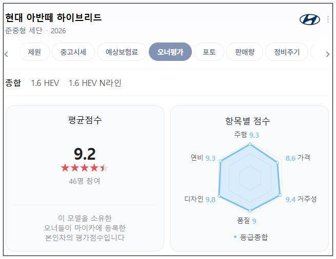 일상적으로 도심 구간을 달리는 오너들은 “리터당 25~30km를 기록했다”는 인증 후기를 쏟아내고 있다. 저속 주행에서 전기모터 주행을 최대한 활용하고, 감속 시 회생제동으로 배터리를 충전하는 방식 덕분이다. 덕분에 일부 운전자들은 아반떼 하이브리드를 두고 “사실상 전기차 같은 하이브리드”라고 표현하기도 한다.