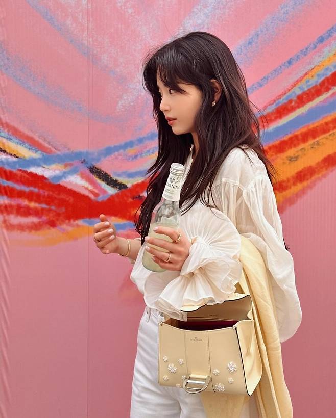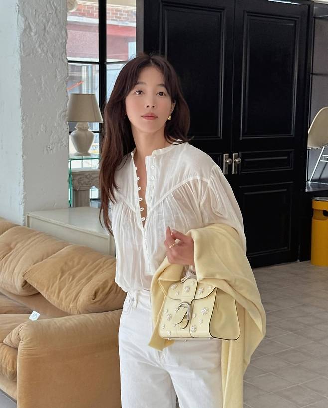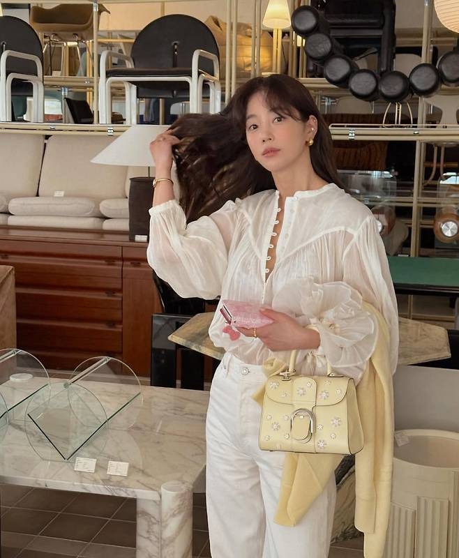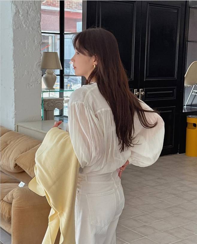 기은세는 러플 디테일이 돋보이는 시스루 셔츠에 하이웨이스트 화이트 데님 팬츠를 매치해 청량하면서도 우아한 무드를 완성했습니다.