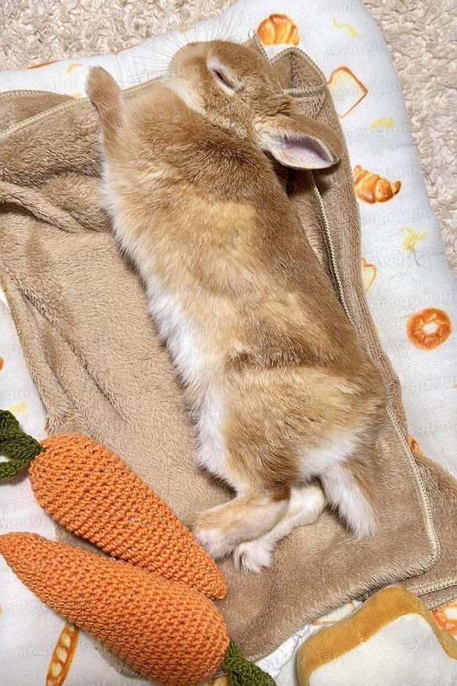 사연은 이렇습니다. 토끼를 키우고 있는 집사는 SNS를 통해 편안한지 무방비한 상태로 이불 위에서 일자로 누워 세상 깊게 잠든 토끼 모습이 잠든 영상을 공개한 것.