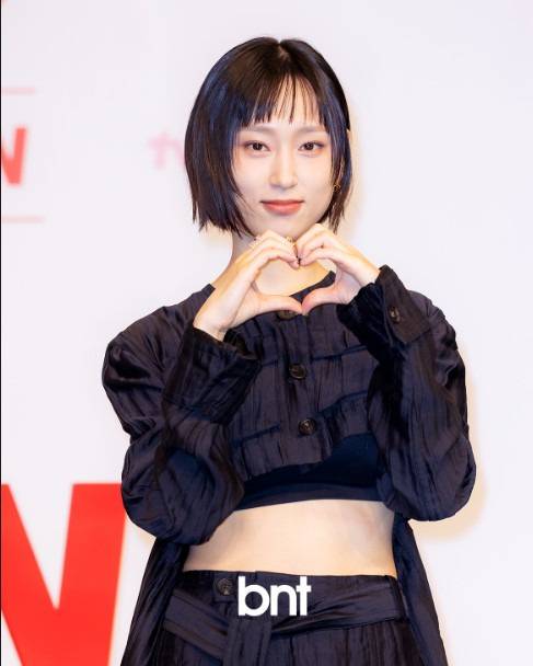 바로 단발 + 크롭 셋업이라는 과감한 조합 덕분인데요. 블랙 크롭 자켓과 하이웨스트 스커트를 매치해 단정하면서도 허리 라인으로 포인트!