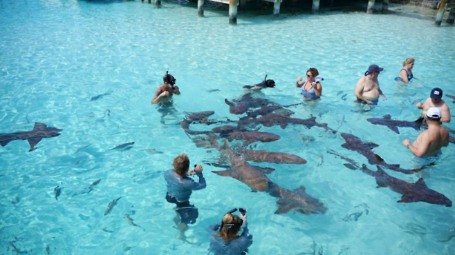 피그비치 인근에 위치한 섬에는 돼지 보다 훨씬 무서운 동물들이 있는데, 바로 바닷속에서 헤엄치는 상어입니다.