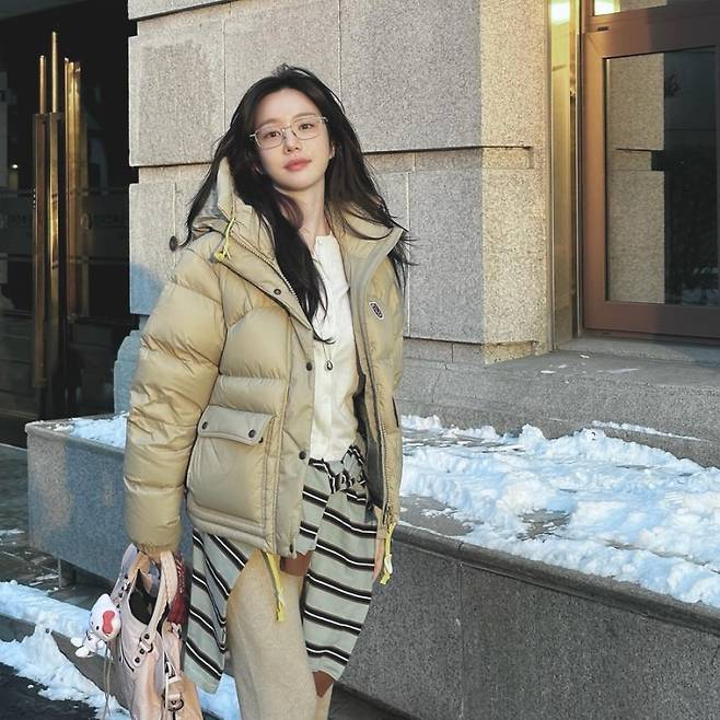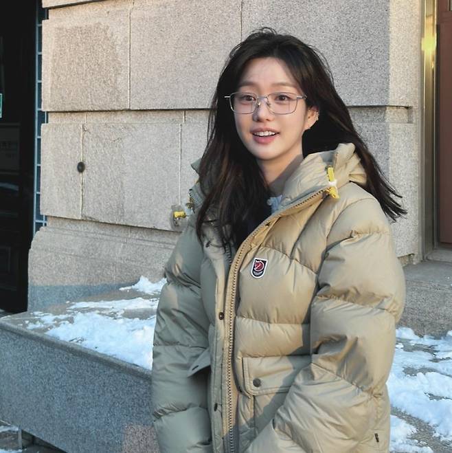 실버 프레임은 자칫 차가워 보일 수 있지만, 이유비의 뽀얀 피부와 베이지 패딩의 따뜻함이 만나면서 오히려 세련된 분위기를 풍깁니다. 안경 하나로 '원래 예쁜 사람' 같은 자연스러운 생활감을 더한 것이 이번 동안 코디의 핵심 포인트라고 할 수 있겠네요.