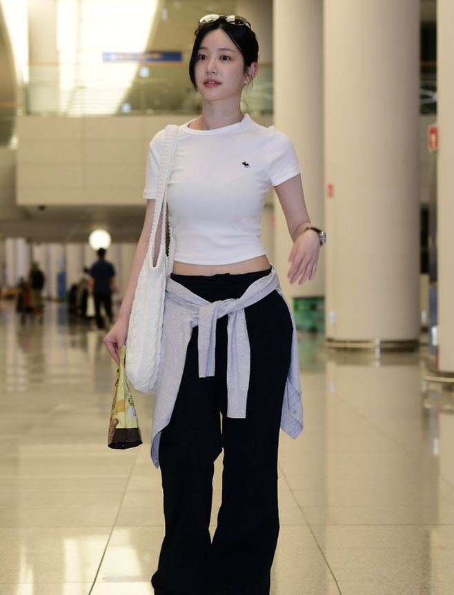 이번에 이유비님은 짧은 기장의 아베크롬비 크롭티에 네트백, 그리고 골반 라인이 드러나는 와이드 팬츠 조합의 공항패션을 선보여 주셨는데요.